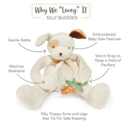 Best Friend Skipit Puppy Silly Buddy animal pacifier holder is a fresh take on a customer favorite. Super-soft and floppy, super silly, and oh so useful, this take-a-long pal will tie onto baby’s stroller, crib, or car seat. a Stuffed animal, lovey, and soother all in one.Â
