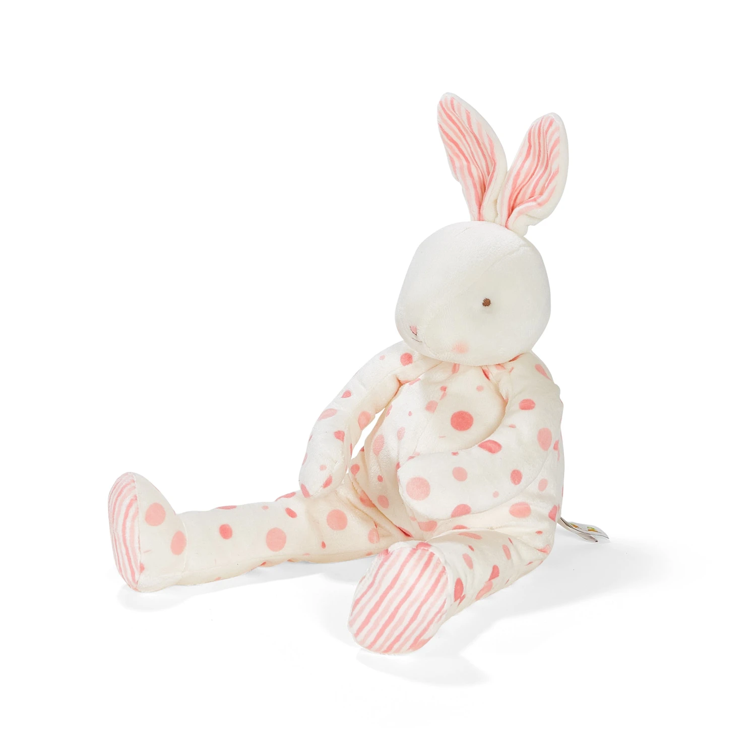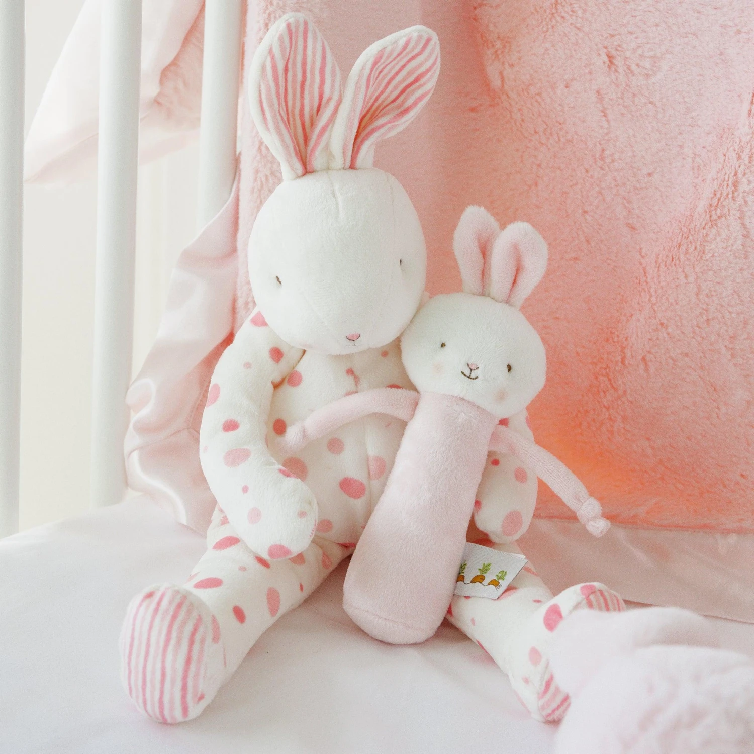 Big Blossom Buddy, the ultimate squishy bunny for little ones to hug and hold! Made with a super-soft velour body and decorated with playful pink polka dots and striped accents in the ears and feet, Big Blossom is as huggable as can be. With its floppy, luggable design, this big bunny buddy is perfect for snuggles and adventures alike, bringing endless comfort and joy to every cuddle session.