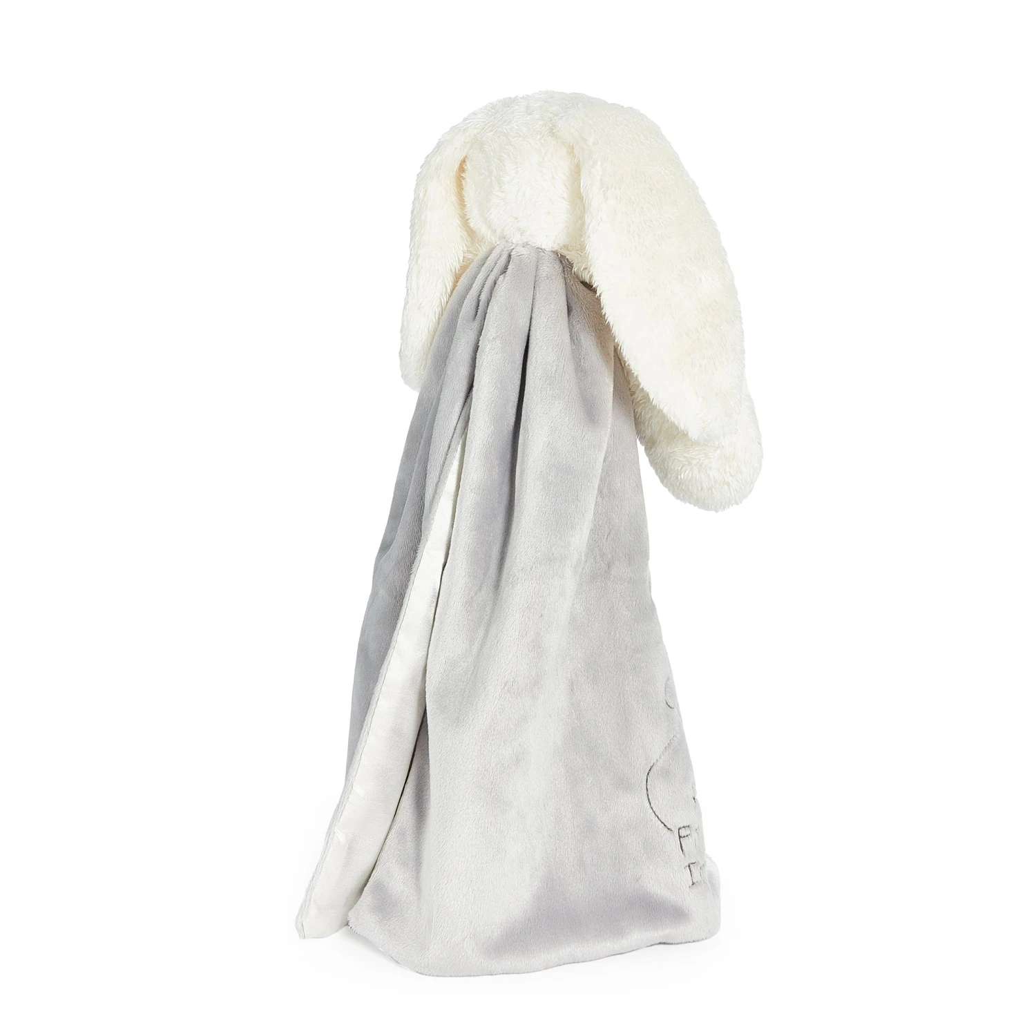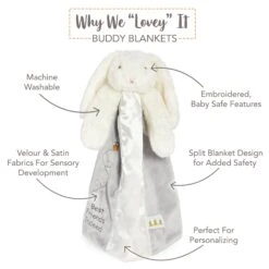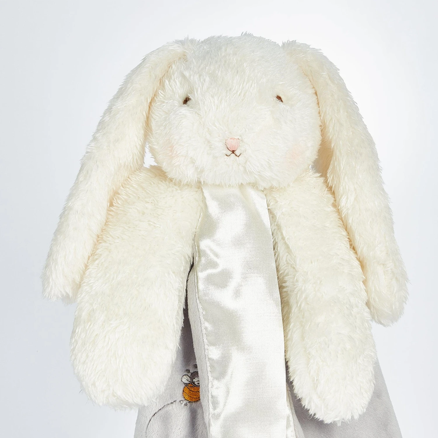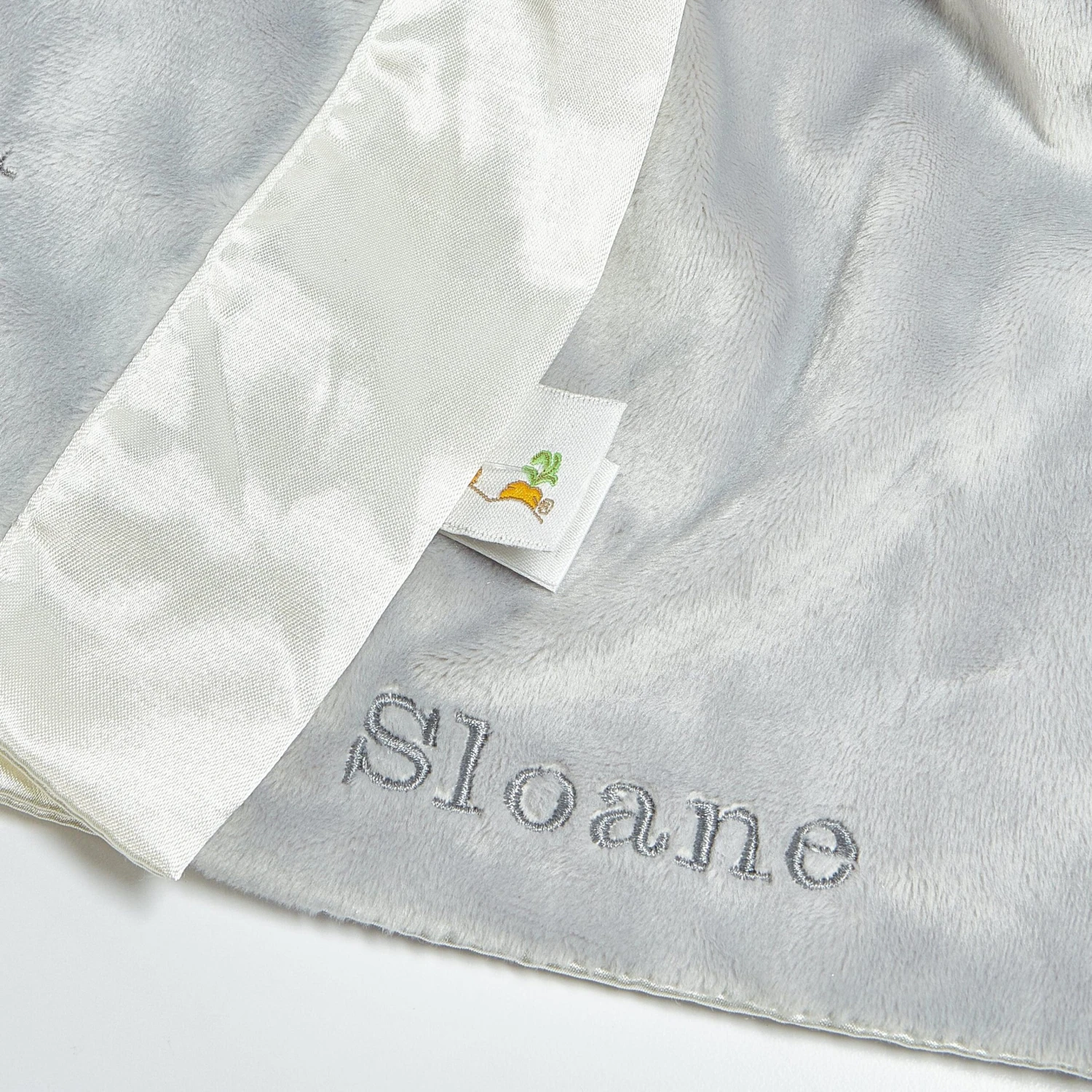 Bloom has a white plush floppy eared bunny stuffed animal head and arms with a handcrafted, baby-safe embroidered face. The snuggly and super soft glacier gray velour split blanket is lined and edged in silky satin for tactile development and soothing and designed with safety in mind. Add a monogram, name, date, or short message with our custom embroidery option to create an even better baby gift that will be treasured for years to come!