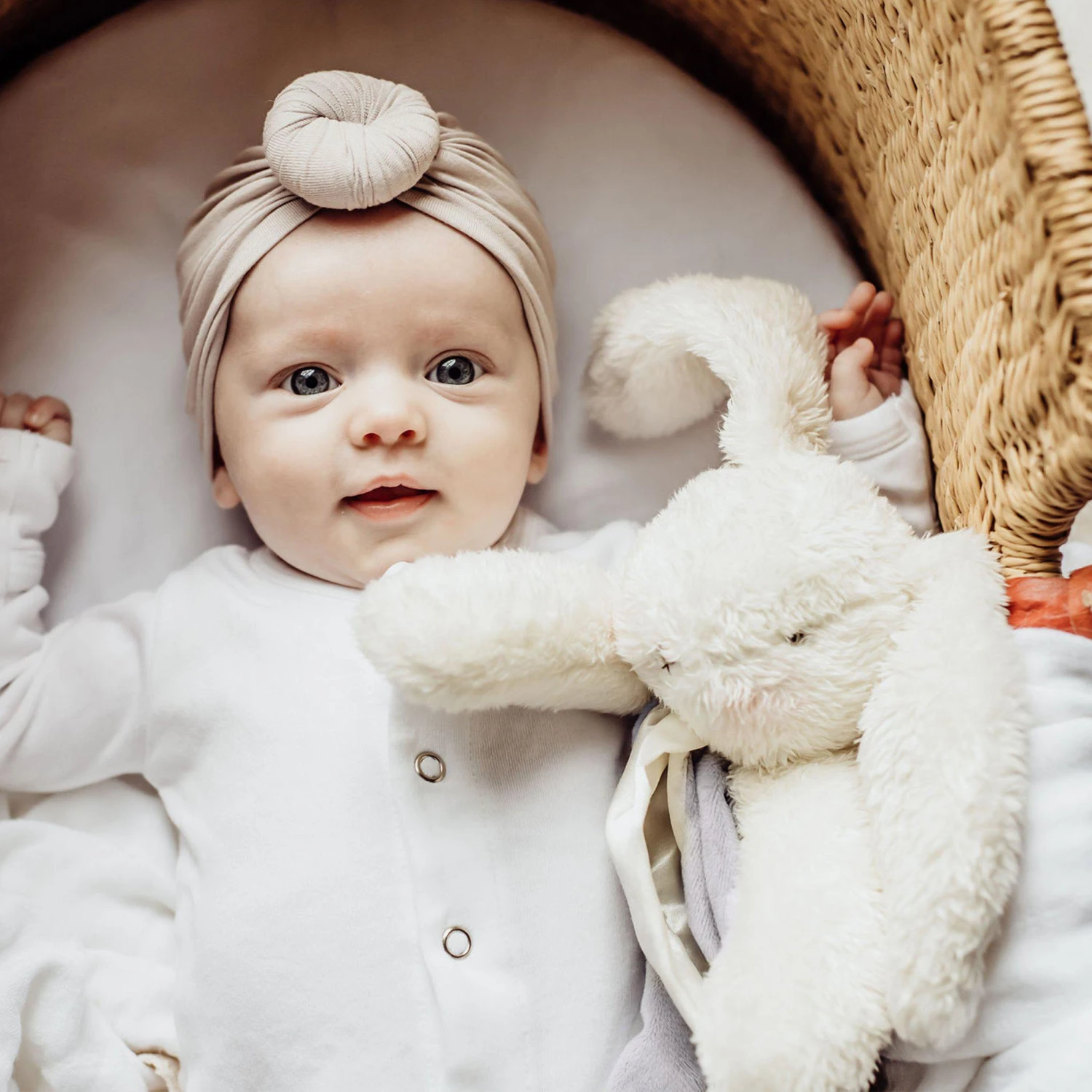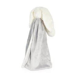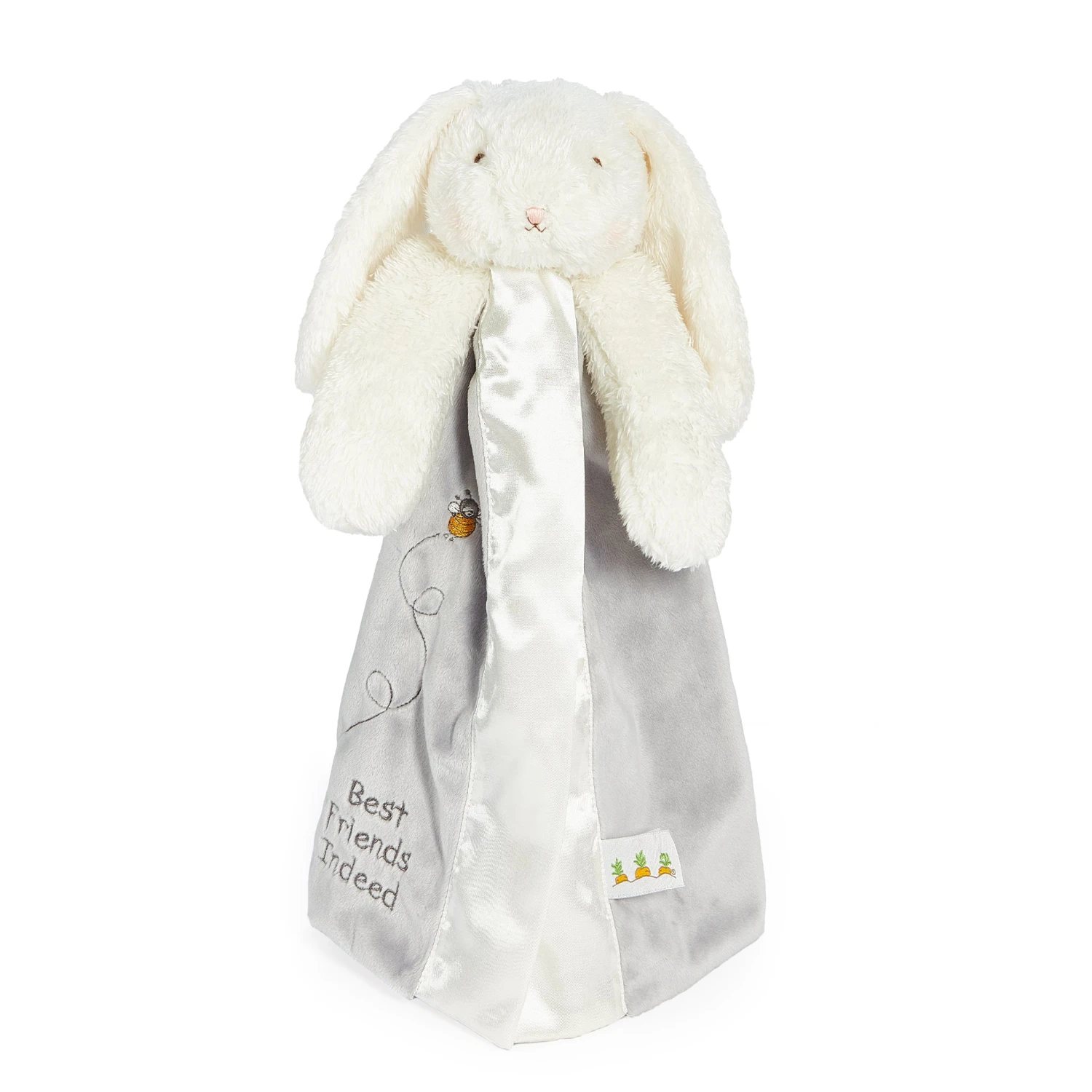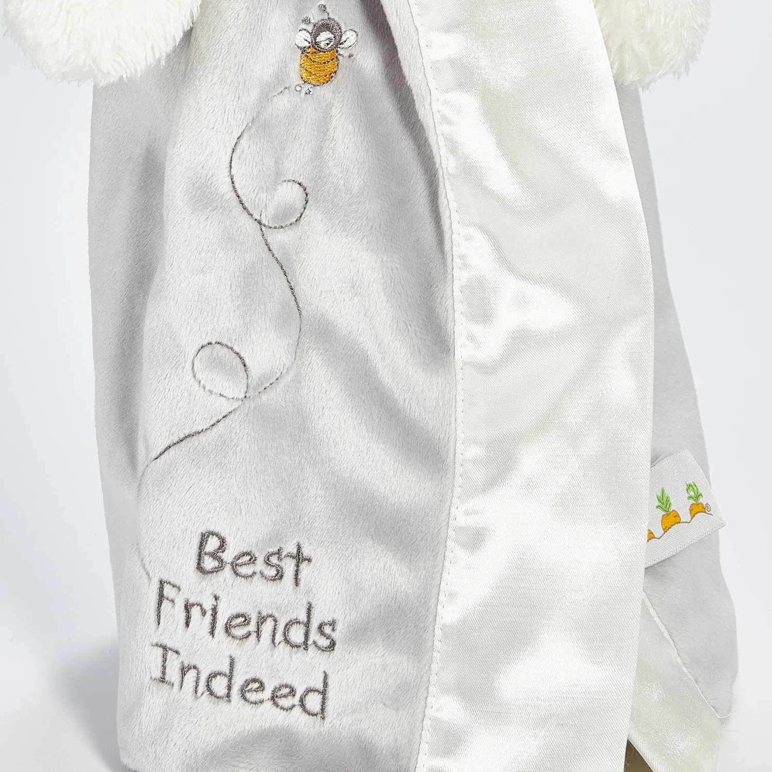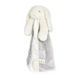Bloom has a white plush floppy eared bunny stuffed animal head and arms with a handcrafted, baby-safe embroidered face. The snuggly and super soft glacier gray velour split blanket is lined and edged in silky satin for tactile development and soothing and designed with safety in mind. Add a monogram, name, date, or short message with our custom embroidery option to create an even better baby gift that will be treasured for years to come!
