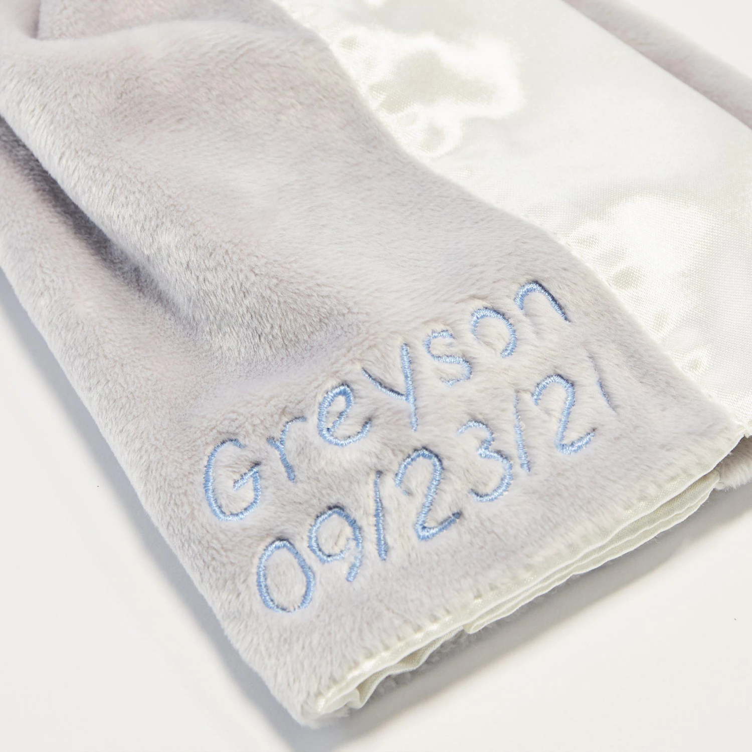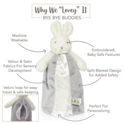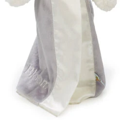 This favorite security blanket is a plush floppy eared stuffed bunny with handcrafted, baby-safe embroidered face and a snuggly soft gray velour split blanket, lined and edged in silky white satin.Â