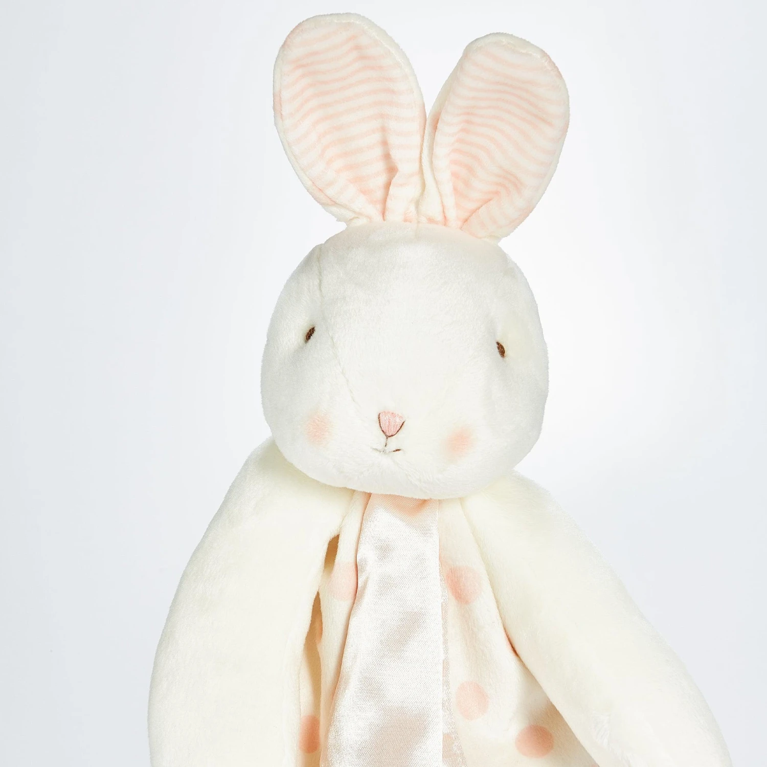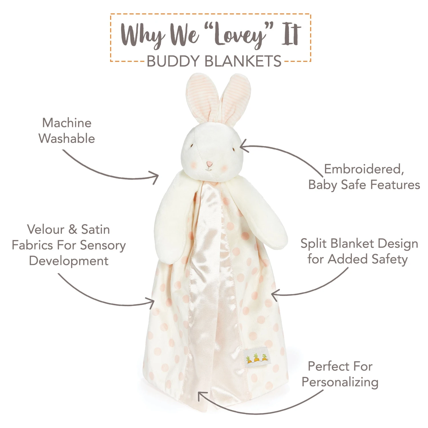 Big 16″ size for cuddling with a super-soft bunny head and arms with handcrafted, baby-safe embroidered face details and adorable polka dot lined ears. The split blankey design in snuggly pink and white polka dot velour is designed for safe and easy snuggling. Lined and edged with silk pink satin and finished with our signature three carrot tag that every baby will undoubtedly explore with their little fingers; our security blankets are a must-have comfort for baby. Sure to become a best friend for your little one, the difference is in the details. Add a monogram, name, date, or short message with our custom embroidery option to create an even better baby gift that will be treasured for years to come!