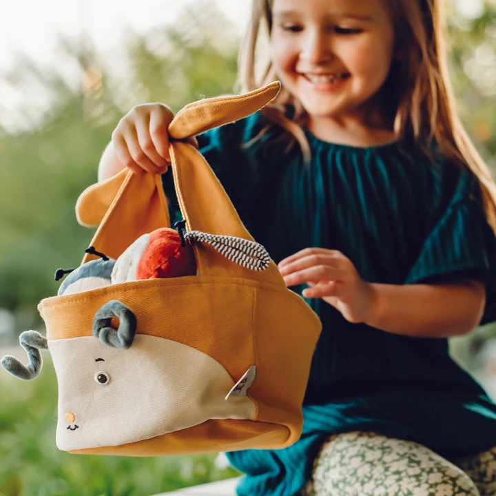 The perfect soft bucket to present the most perfectly delightful gift. Soft Tangerine and Cream canvas with a sweet, embroidered Bug face and floppy knotted wing handle for personalization. This bucket is perfect for an Easter basket, toy bin, and room decor!