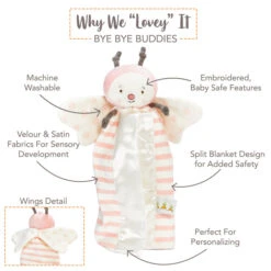 A delightful Garden Friend indeed, Butterfly Bye Bye Buddy Blanket! With a pink velour body, adorned with an expertly embroidered face, is both endearing and thoughtfully crafted with your little one’s safety in mind. Dainty knotted gray velour serves as her antennas and arm adding a charming touch to her whimsical design, and gentle polka-dotted wings not only enhance her beauty but adds a touch of nature’s wonder.