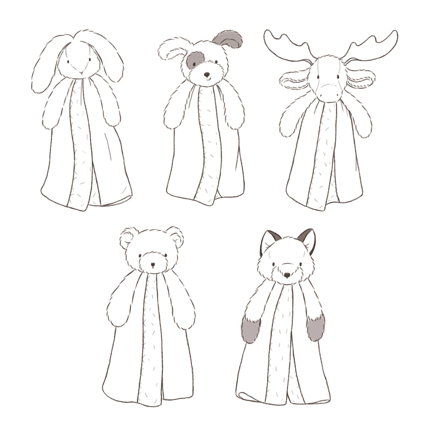 Custom created orders of our retired plush friends, buddy blankets, bye bye buddies, knotty friends, silly buddies and some blankets.