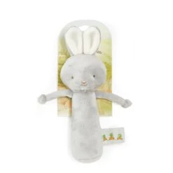 Friendly Chime Bunny is made of soft gray velour with adorably perky bunny ears and hand-embroidered details for its too cute bunny face, with pinked cheery cheeks, and soft dangling arms for chewing and soothing.Â