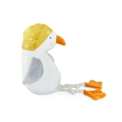 Like any seagull, Gulliver has had many travels, but still calls Cricket Island home. Soft and squishy stretch velour body with carrot orange feet and beak. Gray and cream pinstripe knit for his dangly legs and sunny yellow polka dot sou’wester to brighten up those rainy days.