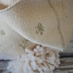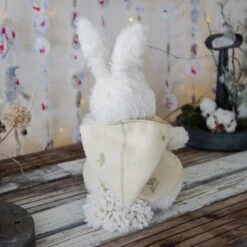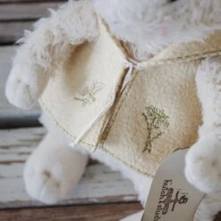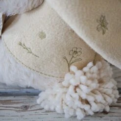 Materials:  Milky white distressed German Mohair, warm white wool and big cotton pom pom tail. 15 inches tall. Wearing a Butter yellow cloak with green floral embroidered design.