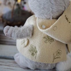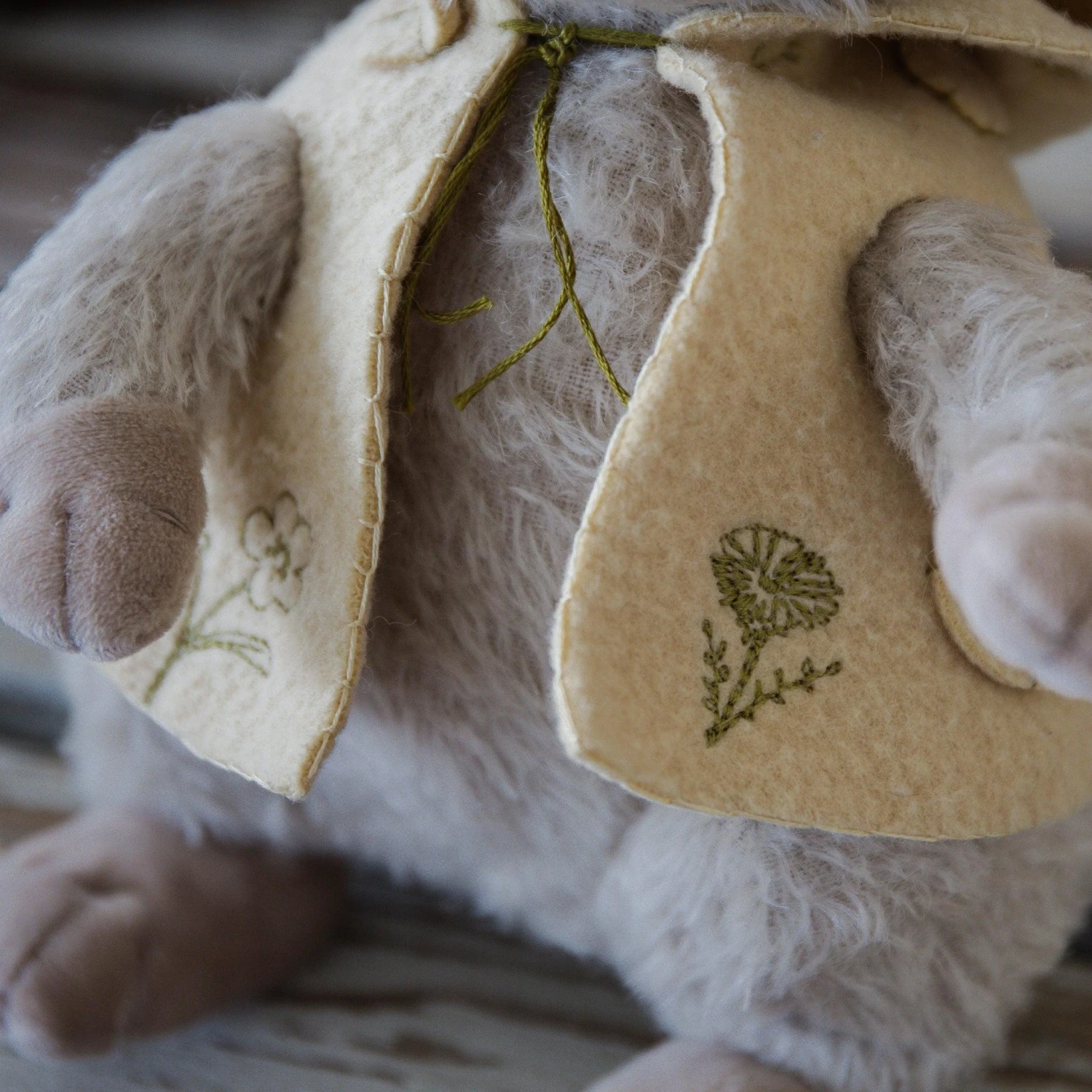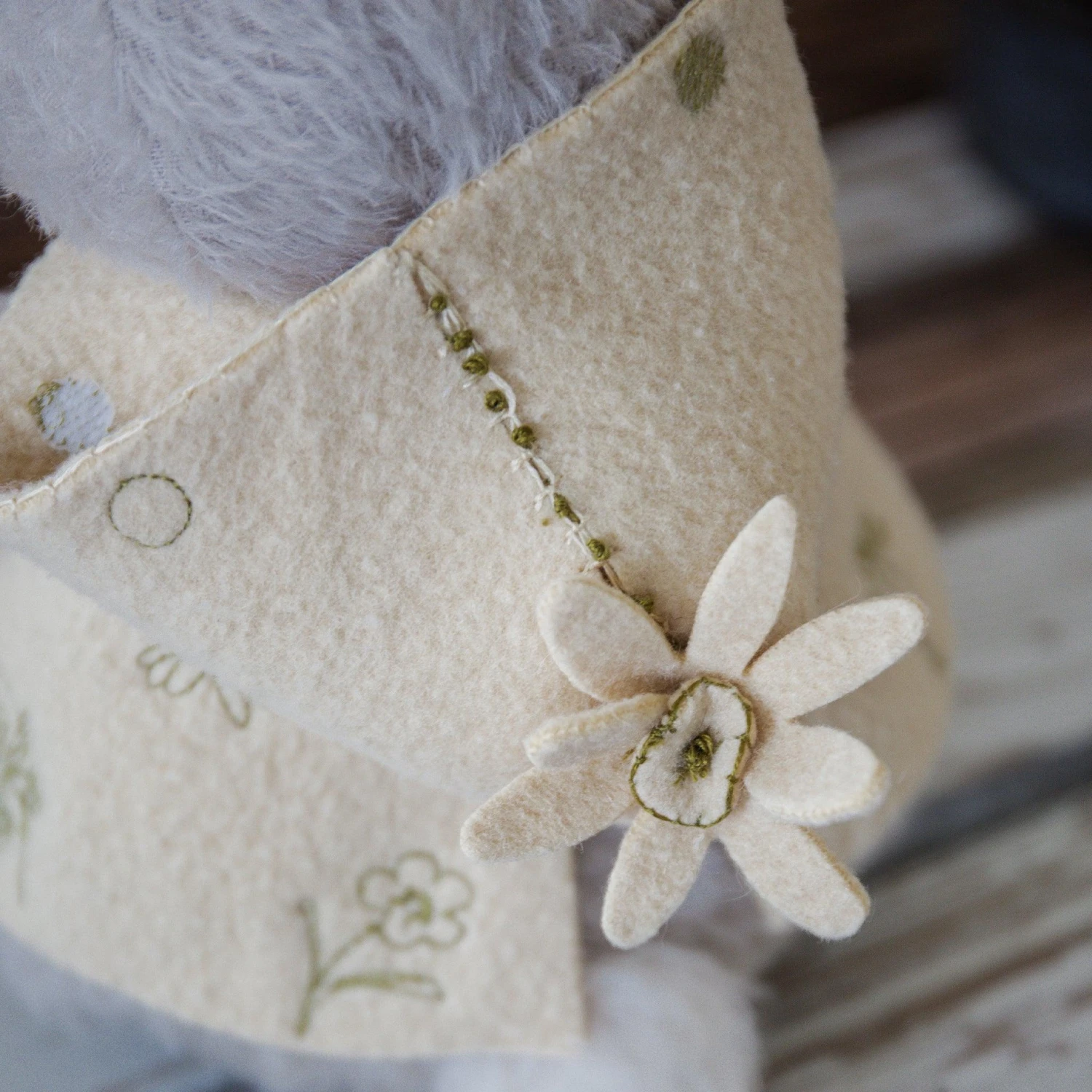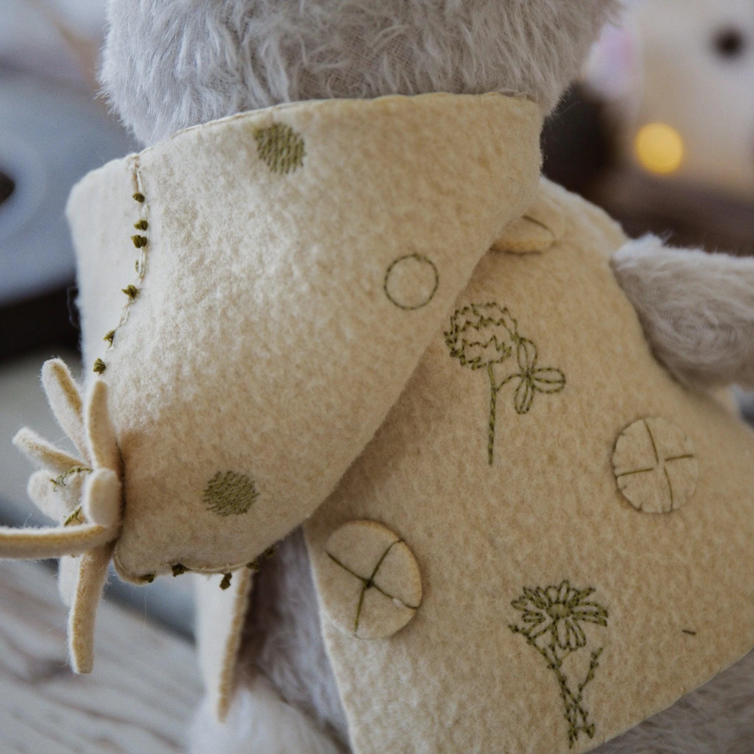 Materials: Fog gray mohair with cream mohair stripe. 13 inches tall. Wearing a Butter yellow cloak with green floral embroidered design.
