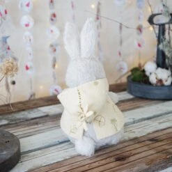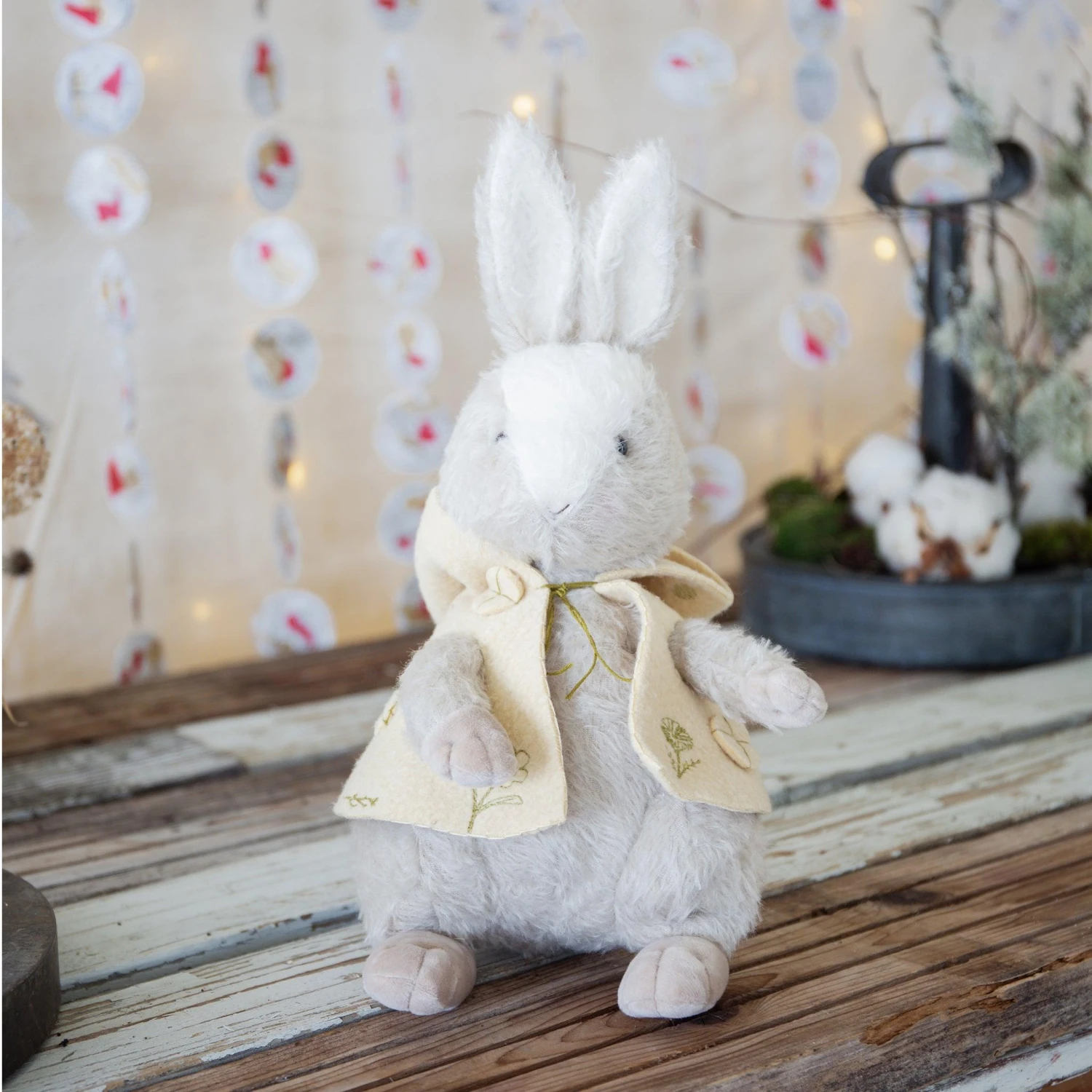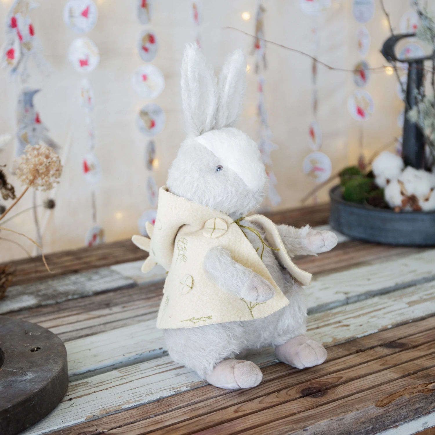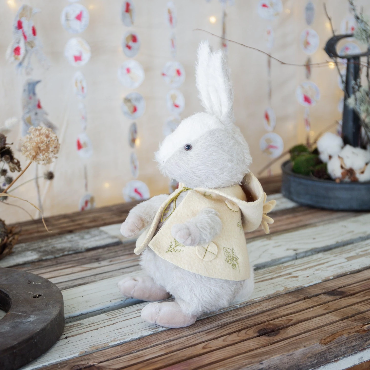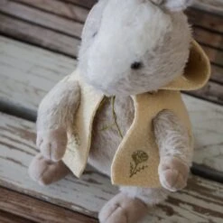 Materials: Fog gray mohair with cream mohair stripe. 13 inches tall. Wearing a Butter yellow cloak with green floral embroidered design.