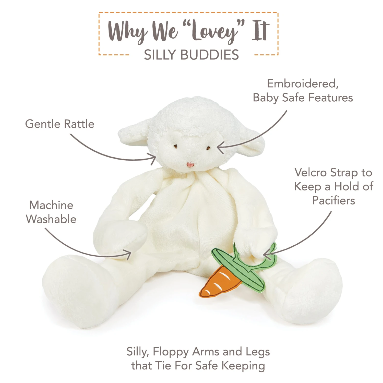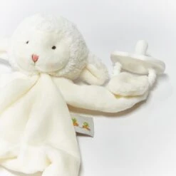Our Kiddo Silly Buddy animal pacifier holder is a fuzzy, furry lamb whose playful embroidered face smiles from atop a cozy warm-white velour body. Kiddo’s long, huggable arms and legs are ever-so-lightly stuffed, making them easy for baby to grasp and so comforting to hold onto. With pacifier holder hand loop and fun rattling head, this is sure to be a favorite security item of Baby and Mom and Dad alike!