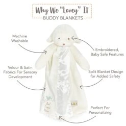 Thousands of 5-Star reviews agree that our Buddy Blankets are the best lovey for your baby! Kiddo the lamb is as fresh as a spring breeze and sure to become a best friend, indeed. A lovey and stuffed animal in one, Kiddo has a handcrafted, baby-safe embroidered face, and our soft warm-white velour security blanket lined and edged in silky satin., with a split design for safety.