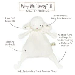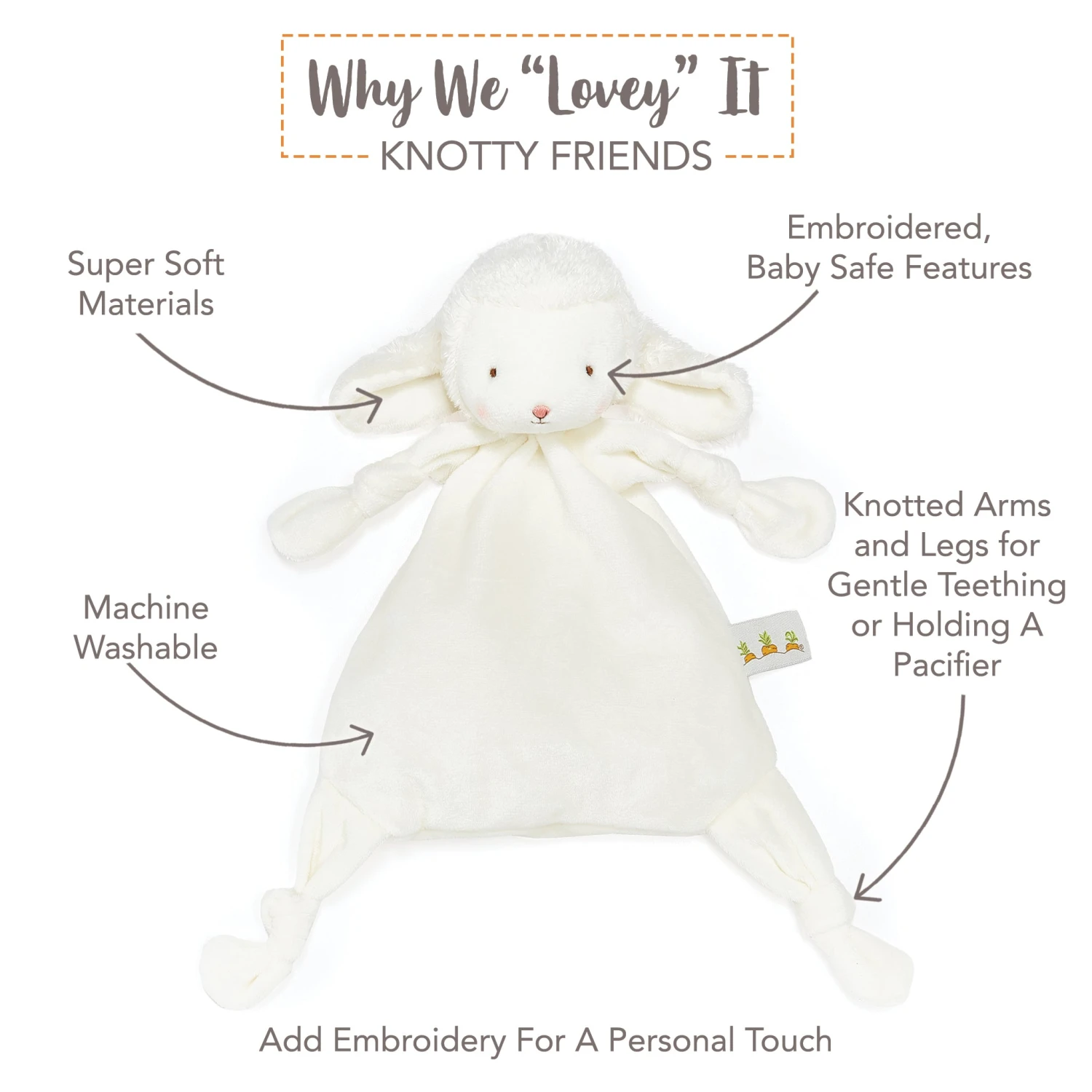 Back by popular demand! Our Knotty Friend loveys have won the hearts of wee ones around the world. A sweet, fuzzy-faced lamb with baby-safe embroidered details, velour floppy body in soft warm white, this knotty friend will not want to be out of your little one’s hands. The knotted arms and legs are perfect for gentle chewing. Signature three carrot tag for little one’s fingers. Add a monogram for an even better baby gift.