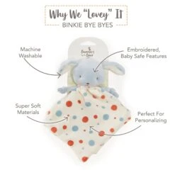 Skipit Binkie Bye Bye, the perfect cuddle companion for little ones on the go! With a plush puppy head, soft polka-dot blanket body, and sweet knotted arms, Skipit is designed for comfort and easy holding.