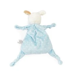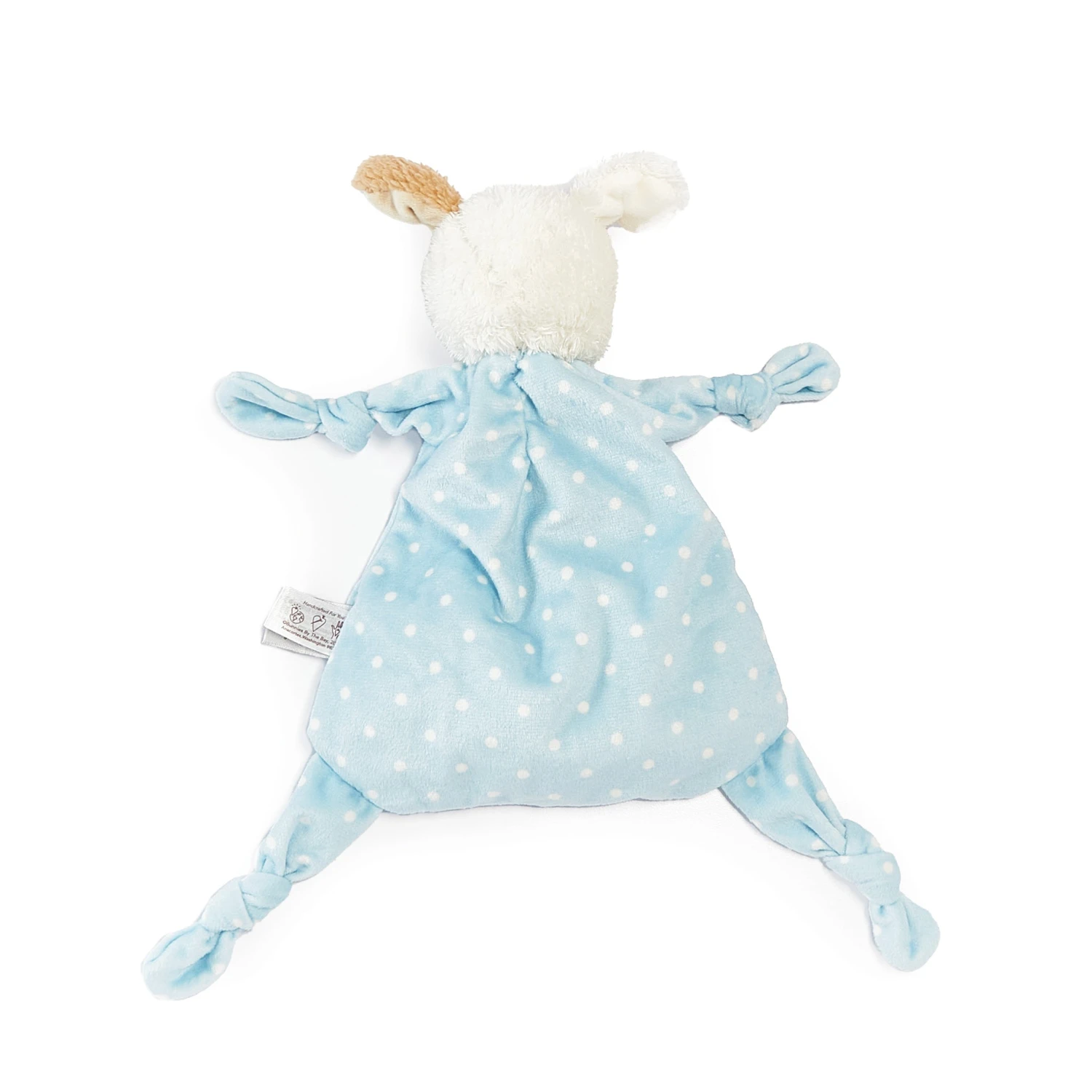 Back by popular demand! Our Knotty Friend loveys have won the hearts of wee ones around the world. A sweet fur baby-safe embroidered face with velour floppy body in powder blue with cream polka dots. This puppy’s knotted arms and legs are perfect for gentle chewing. Untie the knotted arm or leg and re-tie onto baby’s pacifier to keep it close at hand for an even better way to soothe. Signature three carrot tag for little one’s fingers. Add a monogram for an even better baby gift.