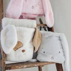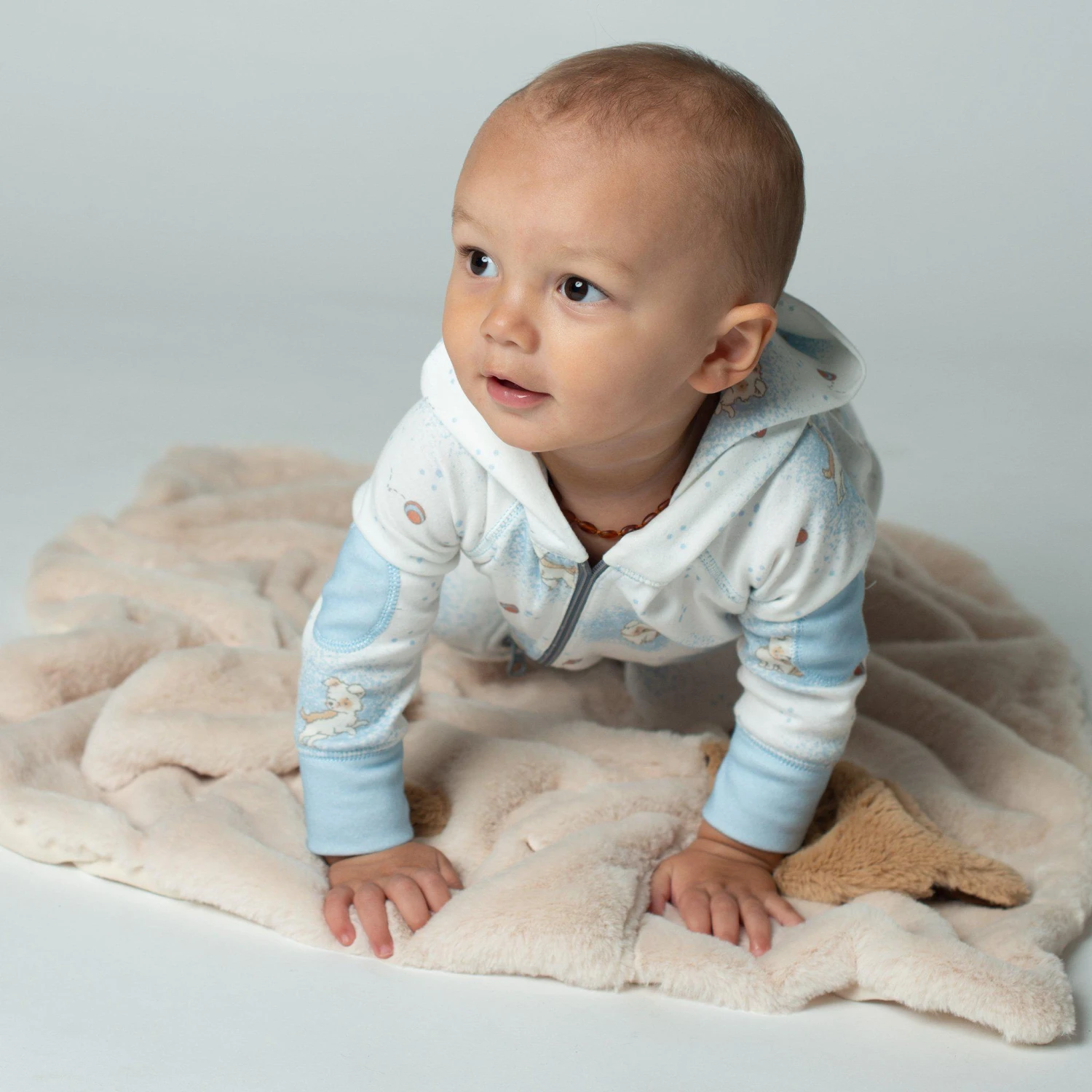 This unique furry baby blanket is super soft and has multiple uses; untucked it’s a blanket with sweet embroidered sleeping puppy eyes and re-tucked it’s a pillow and plush puppy friend with open embroidered eyes ready to play!Â
