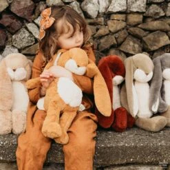 Sweet Floppy Nibble Bunny is sweet, tender and oh-my-gosh unbelievably soft, and now floppier than ever. This stuffed animal has a hand-embroidered face, pink cheeks, and big fluffy tail. Features yummy Almond Joy cream and warm white fur, with velour-lined ears perfect for personalizing. This plush bunny will become your best friend indeed.